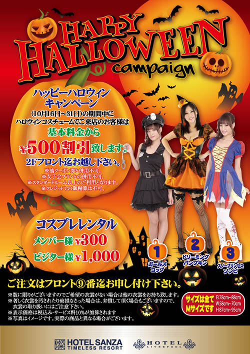 ハロウィンキャンペーン ハロウィンキャンペーン開催! 2025年10月16日~31日 期間中に ハロウィンコスチュームでご来店のお客様は 基本料金500円割引致します! 2Fフロント迄お越し下さい! 大好評!コスプレレンタルも開始!